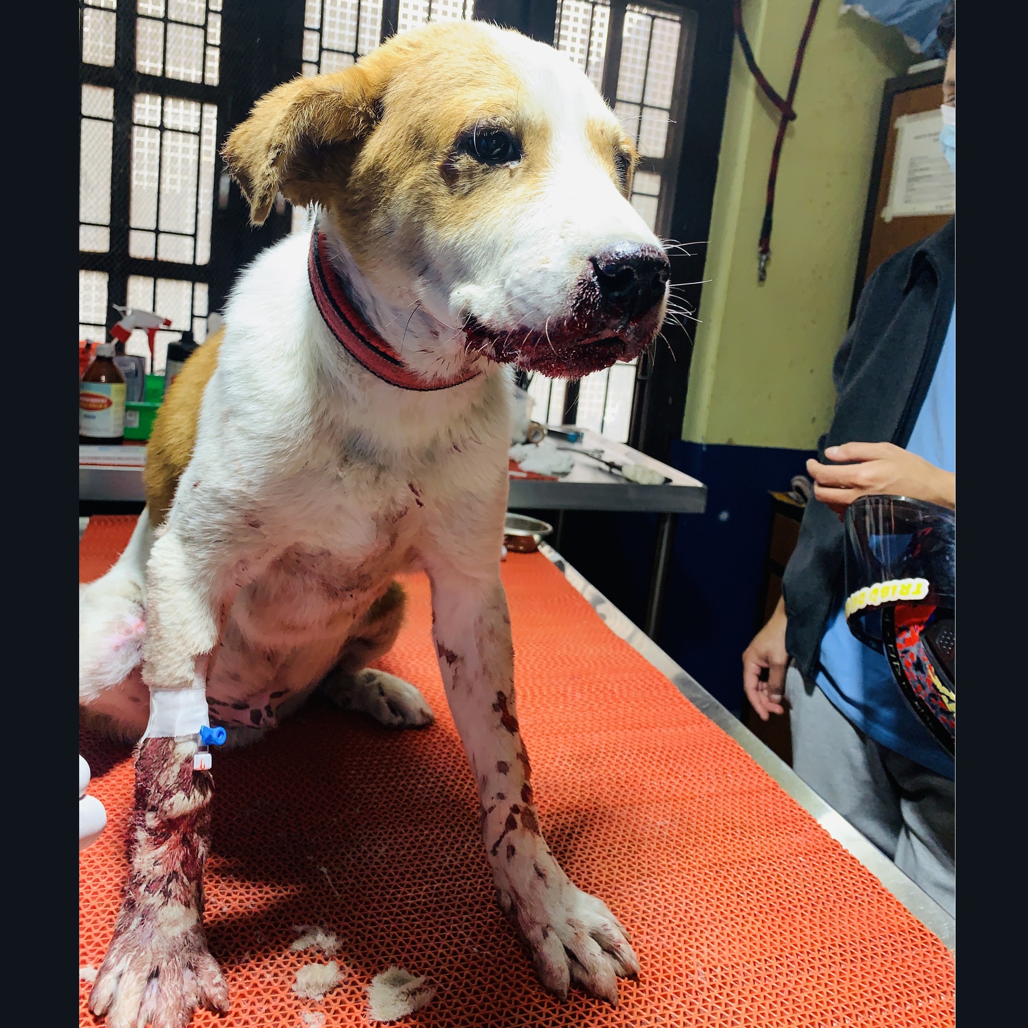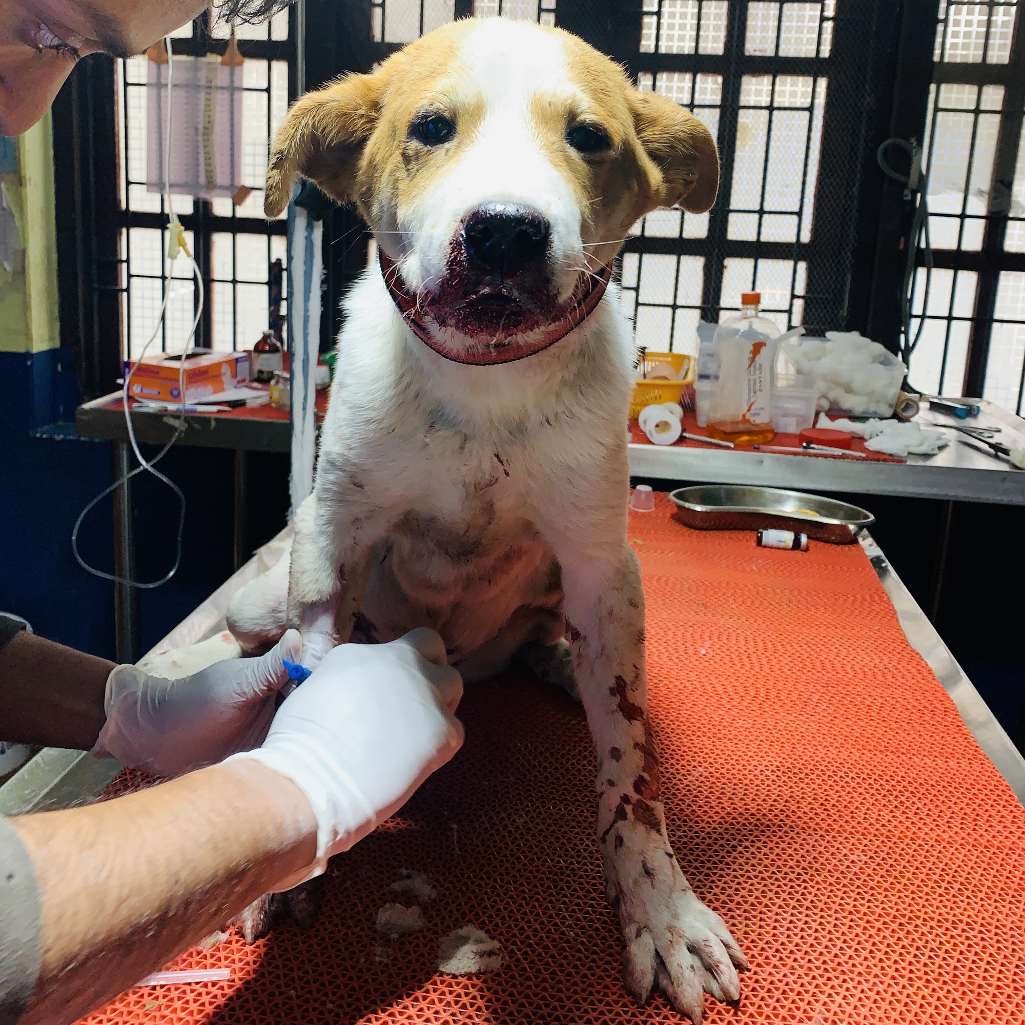 Leo suffered a facial fracture and a broken and laserated leg which caused him a lot of bleeding. Our vets informed us that due to the loss of so much blood that he would likely have not survived more than a few more hours on the street if the boys hadn’t brought him into KAT.